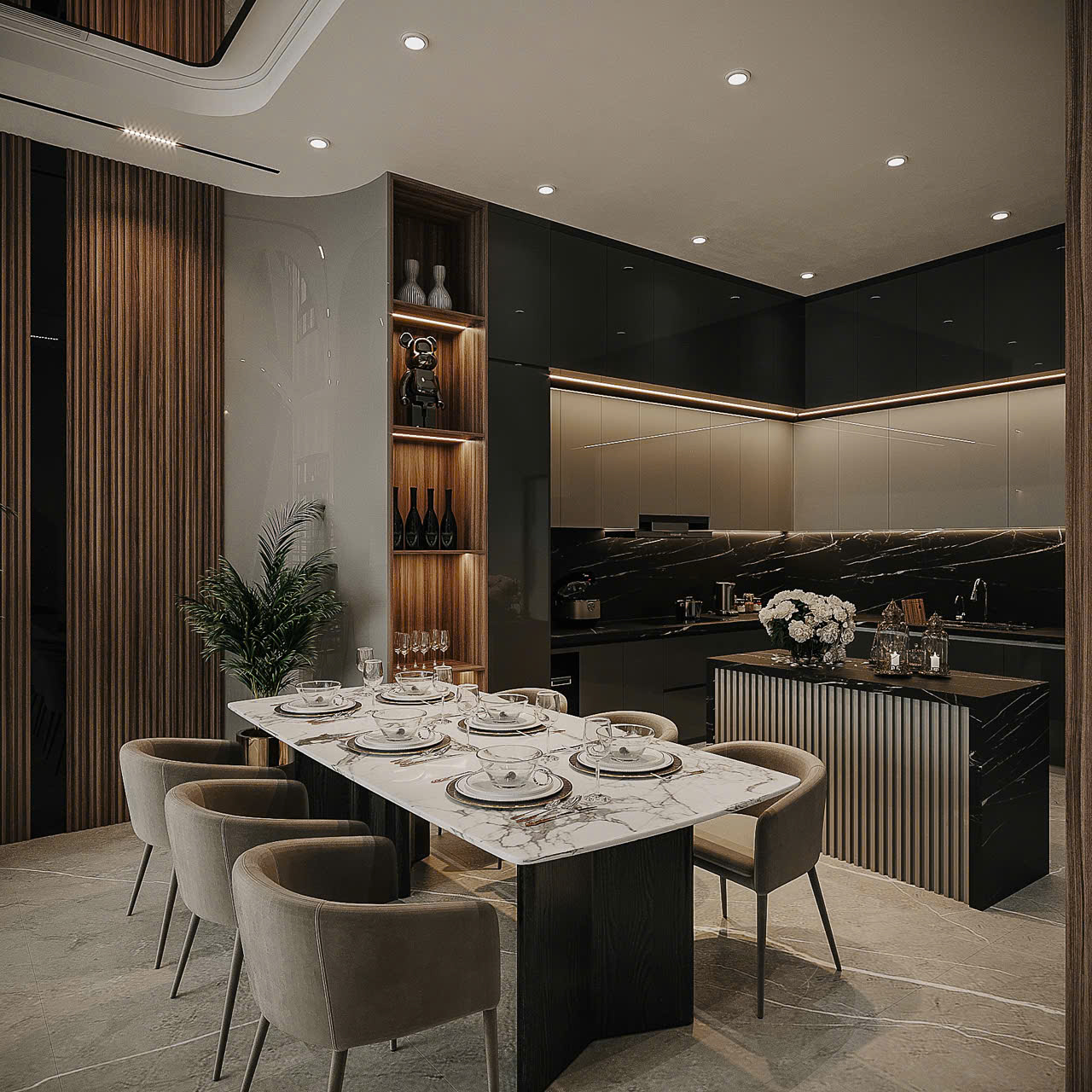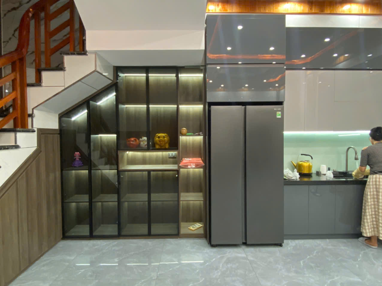 Tủ bếp được thiết kế liền khối hoặc đồng bộ với hệ tủ rượu âm tường/cánh kính, giúp tiết kiệm diện tích mà vẫn nổi bật sự sang trọng. Bạn có thể dễ dàng trưng bày những chai rượu yêu thích, vừa tiện lợi khi tiếp khách, vừa làm điểm nhấn trang trí độc đáo cho toàn bộ gian bếp.