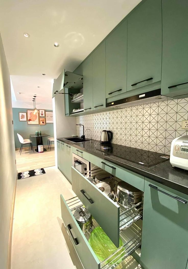 • Phòng bếp: Dạng chữ L hoặc I, sử dụng tủ bếp màu sáng, hệ tủ cao kịch trần, kết hợp đảo bếp làm bàn ăn